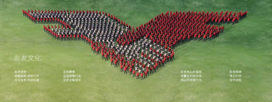 年产销千万吨级,全球规模最大的焊接钢管制造企业——天津友发钢管集团股份有限公司成立于2000年7月1日,总部座落于中国最大的钢管生产基地——天津大邱庄,是集:直缝焊接钢管、热镀锌钢管、内衬塑复合钢管、涂塑钢管、方矩型钢管、热镀锌方矩型钢管、螺旋钢管、高速护栏板等产品于一体的焊接钢管制造企业集团,拥有 “友发”和“正金元”两个品牌。目前已经形成了天津、唐山、邯郸三个生产基地,拥有8家钢管生产企业总计152条生产线,近万名员工,同时拥有2个国家级认可实验室,1个行业内唯一产学研技术研发机构——“天津市焊接钢管技术工程中心”。三大基地生产的产品先后销往北美洲、南美洲、欧盟、非洲、东南亚、中东、大洋洲和香港等66个国家和地区。2016年生产各类钢管突破1200万吨,如果把友发每个星期生产的钢管首尾连接,将会绕地球整整一圈。友发已经实现了连续11年产销量全国第一。连续11年跻身中国企业500强、中国制造业500强。